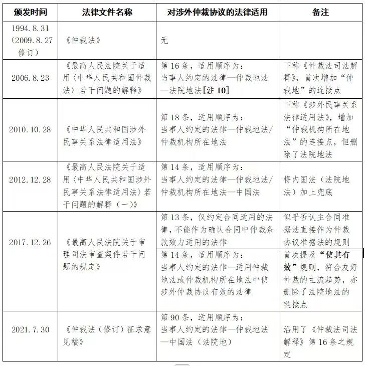 关于涉外仲裁协议的法律适用,我国法律和司法解释的规定有一个历史沿革的过程,随着对仲裁日益友好的态度而增加连接点,具体沿革可总结为下表[注9]: