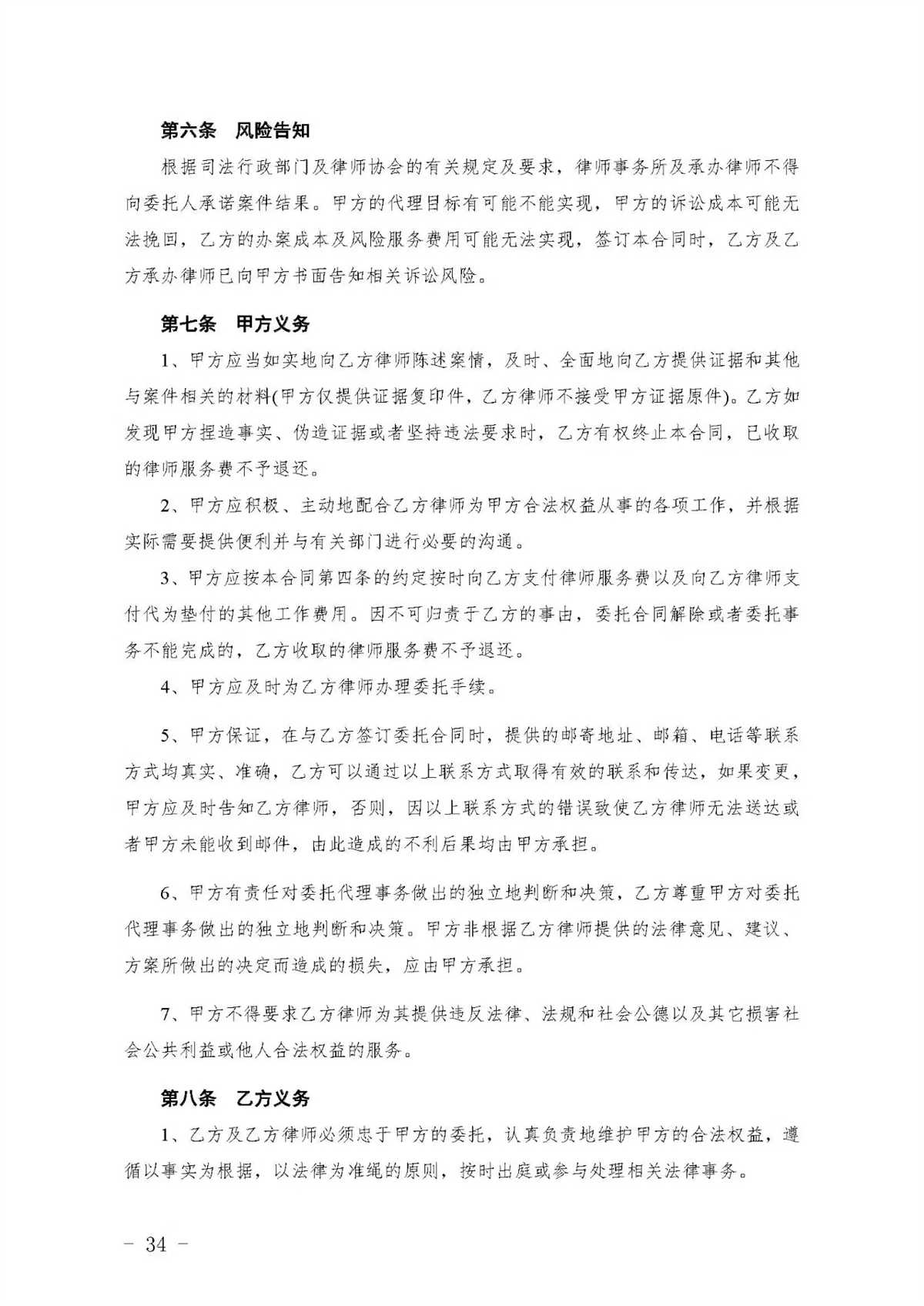 第二十九条 律师事务所和律师不得滥用专业优势地位,对律师事务所与当事人各自承担的风险责任作出明显不合理的约定,不得在风险代理收费合同中排除或者限制当事人上诉、撤诉、调解、和解等诉讼权利,或者对当事人行使上述权利设置惩罚性赔偿等不合理的条件。