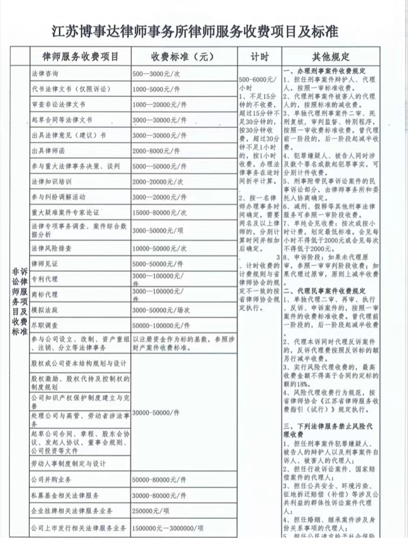 ( 注:如有需要,可在本网站“联系我们”—“下载中心”项下,下载上述江苏博事达律师事务所《律师服务收费项目及标准》及下列《重大、疑难、复杂诉讼案件、仲裁案件认定标准》的电子版。)
